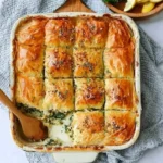 A deliciously flaky spinach pie filled with creamy ricotta, tangy feta, and fresh spinach, wrapped in crispy phyllo layers.