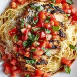 Serve your Bruschetta Chicken Pasta immediately, topped with a generous sprinkle of grated Parmesan cheese to elevate the dish.