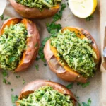 These stuffed sweet potatoes are the perfect harmony of flavor and comfort. They are rich in nutrients and bursting with taste! The sweetness of the potato pairs beautifully with the nutty, herby flavor of the pesto, while the cheese adds that all-too-important creamy finish. Plus, they are versatile enough for a weeknight dinner yet fancy enough for gatherings. What’s not to love?