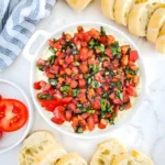 A vibrant and fresh bruschetta dip perfect for gatherings, featuring tomatoes, basil, and garlic served with crispy baguette slices.