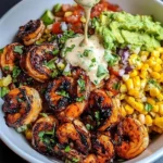 This dish is a fantastic way to bring the beach right to your kitchen table (or patio if you’re lucky!). Juicy, perfectly grilled shrimp sit atop a bed of vibrant, fresh ingredients like creamy avocado and sweet corn salsa, all harmonizing beautifully with the zesty creamy garlic sauce. It’s light yet filling, making it a perfect choice for a weeknight dinner or a summer gathering. The fresh cilantro sprinkled on top adds that final touch of brightness, boosting the dish’s appeal both in terms of flavor and presentation.